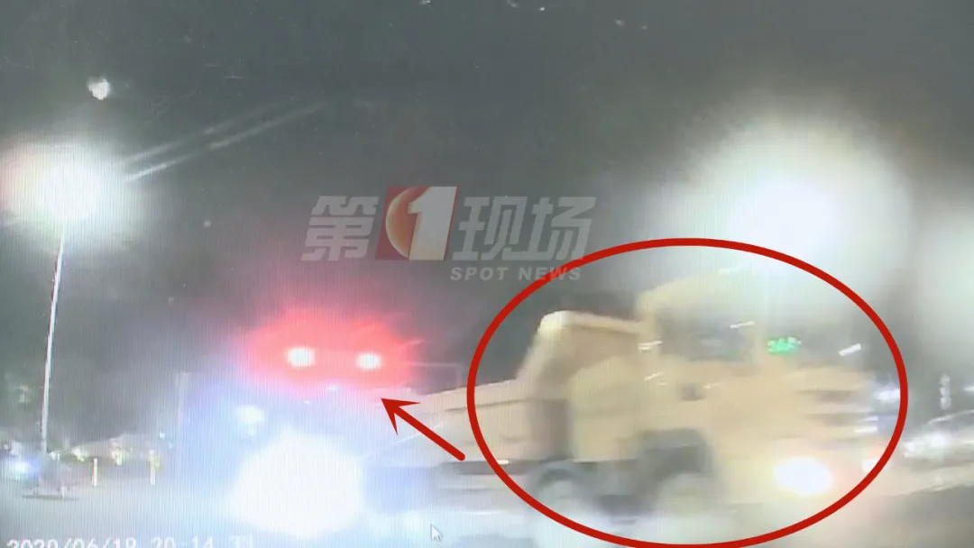 事故發(fā)生在6月19號晚上8點多,可以看到黑色小車在信號燈開始閃爍的時候開過光僑路路口,正好被一輛左轉(zhuǎn)泥頭車擋住了路。