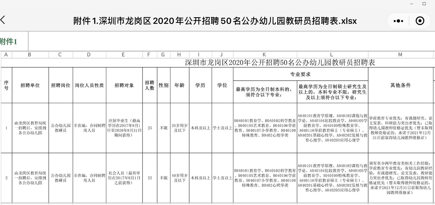 ■附:深圳市龍崗區(qū)2020年公開(kāi)招聘50名公辦幼兒園教研員招聘表