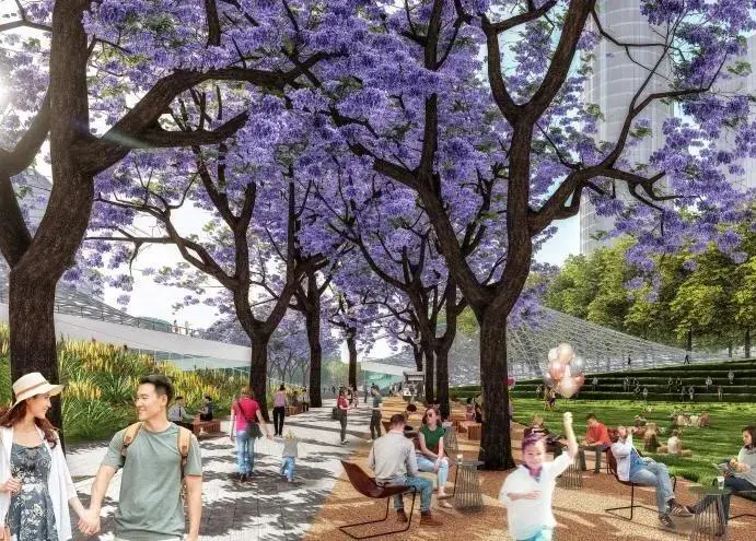 為車站廣場,“水晶山丘”屋面覆蓋著地下車站樞紐大廳,同時也在地面創(chuàng)造出造型獨特的城市地標。光影和夜景效果與交叉的藍花楹大道配合,打造一個極具設計感的交通集散空間。地下共享大廳、地下森林與地面廣場、周邊建筑建立視覺聯(lián)系,成為中央綠軸美景的一部分。