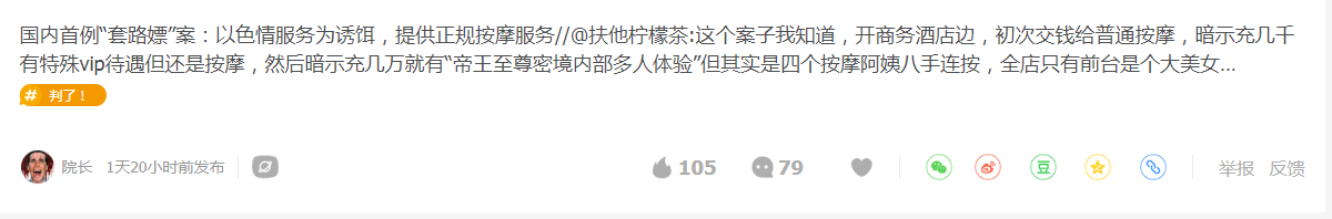 據(jù)報(bào)道,浙江一家SPA俊顏館初次交錢有普通按摩,暗示客戶充值有特殊服務(wù),實(shí)際上是高級(jí)一點(diǎn)的按摩,再暗示充幾萬(wàn)可享受“帝王至尊密境內(nèi)部多人體驗(yàn)”,其實(shí)就是四個(gè)按摩阿姨八手連按。