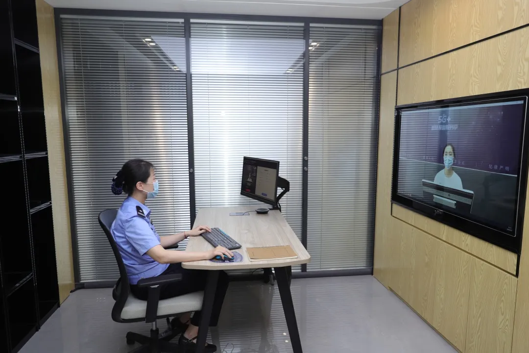 ▲民警通過5G自助報(bào)警終端向報(bào)警人了解情況