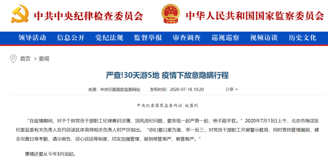 2020年7月13日上午,北京市海淀區(qū)紀(jì)委監(jiān)委有關(guān)負(fù)責(zé)人在約談該區(qū)體育局相關(guān)負(fù)責(zé)人時嚴(yán)厲指出。“你們要以案為鑒,舉一反三,對黨員干部職工開展警示教育,同時查找管理漏洞,健全完善日常考勤、請示報告、談心談話等制度,切實加強(qiáng)管理,做到常管常嚴(yán)、敢管敢嚴(yán)。”
