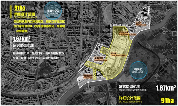 競賽由深圳市投資控股有限公司主辦,深港科技創(chuàng)新合作區(qū)發(fā)展有限公司承辦,深圳市規(guī)劃和自然資源局、深圳市建筑工務(wù)署、福田區(qū)人民政府為技術(shù)指導(dǎo)單位,旨在落實(shí)關(guān)于皇崗口岸片區(qū)遴選國際一流設(shè)計師進(jìn)行整體設(shè)計、統(tǒng)一開發(fā)、連片建造的要求,通過“定向邀請5家+資格預(yù)審10家”的方式,遴選了15家國際知名設(shè)計機(jī)構(gòu)參賽。其中,詳細(xì)設(shè)計范圍包括現(xiàn)狀皇崗口岸貨檢區(qū)、口岸生活區(qū)及口岸周邊地塊,面積約0.91平方公里;研究協(xié)調(diào)范圍為河套C區(qū),包括詳細(xì)設(shè)計范圍及周邊的福田口岸、赤尾村等區(qū)域,面積1.67平方公里。