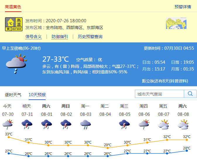 記者從深圳市氣象臺了解到,7月30日多云,有(雷)陣雨,局部雨勢較大。30日夜間至8月1日白天受偏東氣流影響,有間歇性雷陣雨,局部暴雨,雨時伴有短時8級陣風(fēng),高溫天氣緩解,2-5日有明顯降雨過程。