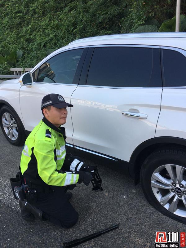 事情發(fā)生在10月11日早上10時(shí)30分許,劉先生駕車(chē)出外辦事,車(chē)輛行駛至東環(huán)高架西往東方向時(shí),突然一聲巨響左后輪輪胎爆裂車(chē)輛半路拋錨,當(dāng)時(shí)正值交通早高峰,過(guò)往車(chē)輛不斷,故障車(chē)輛停在道路中間導(dǎo)致路段交通擁堵,車(chē)主劉先生一時(shí)間不知所措,只能留在原地等待救援。此時(shí)正在執(zhí)行巡邏任務(wù)的羅湖交警鐵騎組長(zhǎng)陳展廷見(jiàn)狀,立即停下警車(chē)上前查看情況,了解情況后,為了緩解該路段的交通擁堵,防止出現(xiàn)交通意外,陳展廷立即讓劉先生把車(chē)停靠在最右側(cè)車(chē)道,然后安排隊(duì)員用警車(chē)在故障車(chē)輛周邊設(shè)置出了安全警戒區(qū)域,另一位隊(duì)員則對(duì)過(guò)往車(chē)輛進(jìn)行指揮疏導(dǎo)及勸慰駕駛?cè)瞬灰?,在安全區(qū)域等待,陳展廷則俯下身為爆胎車(chē)輛更換輪胎。約15分鐘的忙碌后,三位鐵騎隊(duì)員已滿(mǎn)身是汗,但在他們的密切協(xié)調(diào)配合下,快速幫助駕駛?cè)藙⑾壬鷶[脫困境,險(xiǎn)情在最短時(shí)間內(nèi)被及時(shí)排除,道路交通秩序也恢復(fù)正常,這暖心一幕讓劉先生很是感動(dòng),緊緊握著陳展廷同志的手連聲表示感謝。