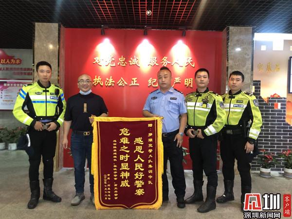 10月14日上午11時(shí)許,劉先生帶著錦旗來(lái)到羅湖交警大隊(duì)?!案兄x交警大隊(duì)機(jī)訓(xùn)中隊(duì)陳展廷組長(zhǎng)、黎警官、黃警官對(duì)我的幫助,今天專(zhuān)程過(guò)來(lái)感謝你們?!眲⑾壬?dòng)地說(shuō)。