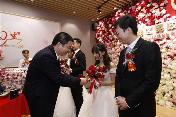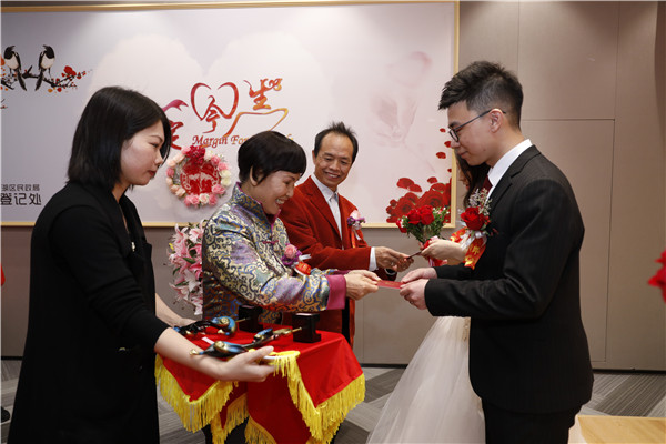 銀婚老人為12對新人頒發(fā)結婚證
