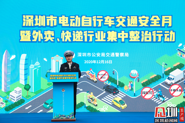 見圳客戶端·深圳新聞網(wǎng)12月16日訊(記者 郭含笑 通訊員 劉明)12月16日下午,深圳交警在羅湖區(qū)東門文化廣場(chǎng)舉行深圳市電動(dòng)自行車交通安全月暨外賣、快遞行業(yè)集中整治行動(dòng)啟動(dòng)儀式?,F(xiàn)場(chǎng)邀請(qǐng)全市外賣、快遞企業(yè)代表參加啟動(dòng)儀式。深圳市交警局局長(zhǎng)徐煒、深圳市交警局副局長(zhǎng)馮新毅及相關(guān)領(lǐng)導(dǎo)班子出席了啟動(dòng)儀式。