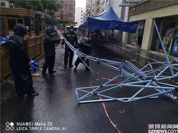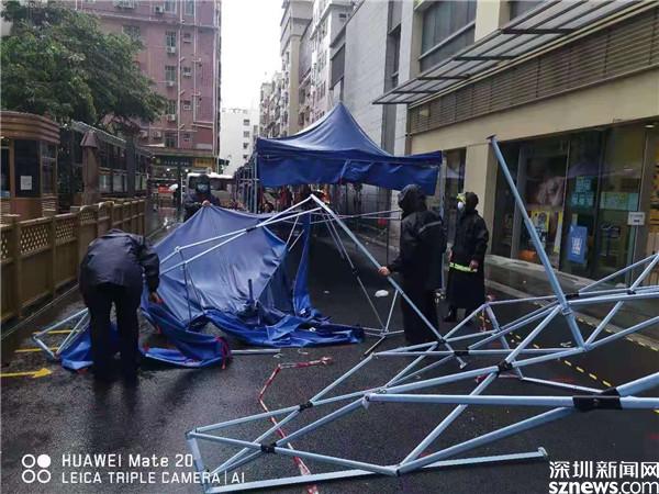 6月22日早上,黃貝街道工作人員在風(fēng)雨中搭建核酸檢測(cè)點(diǎn)帳篷。