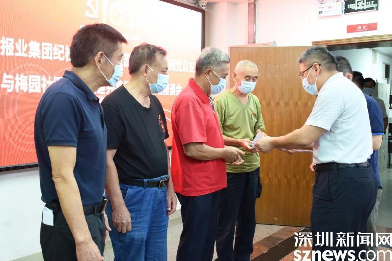 黨課結(jié)束后,陳鵬等代表深圳報業(yè)集團(tuán)一行對社區(qū)老黨員進(jìn)行慰問,并向老黨員代表送上慰問金和禮包,隨后,陳鵬向梅園社區(qū)“光榮在黨50年”老黨員們頒發(fā)紀(jì)念章,“你們辛苦了,我們要向你們學(xué)習(xí),希望你們注意身體,繼續(xù)為社區(qū)做貢獻(xiàn)?!标慁i捧起紀(jì)念章,為老黨員們戴上,并對老黨員們送上關(guān)心和祝福。