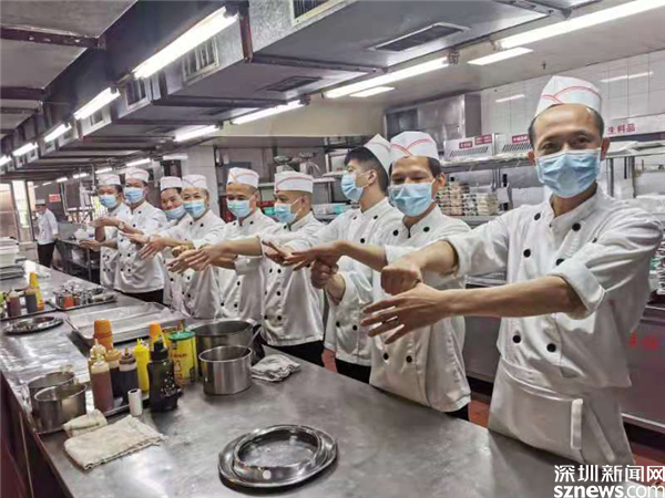 后廚人員正在學(xué)習(xí)“七步洗手法”。