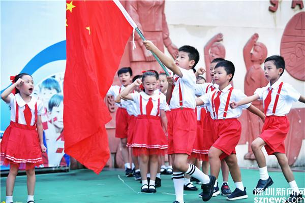 蓮南小學的開學典禮上,二(8)班少先隊員在國旗下,用生動活潑的歌舞,表達對新學期的期待,對黨的熱愛。