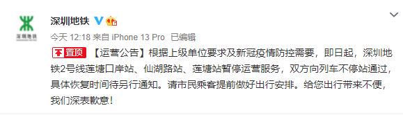 根據(jù)上級(jí)單位要求及新冠疫情防控需要,即日起,深圳地鐵2號(hào)線蓮塘口岸站、仙湖路站、蓮塘站暫停運(yùn)營(yíng)服務(wù),雙方向列車不停站通過,具體恢復(fù)時(shí)間待另行通知。請(qǐng)市民乘客提前做好出行安排。