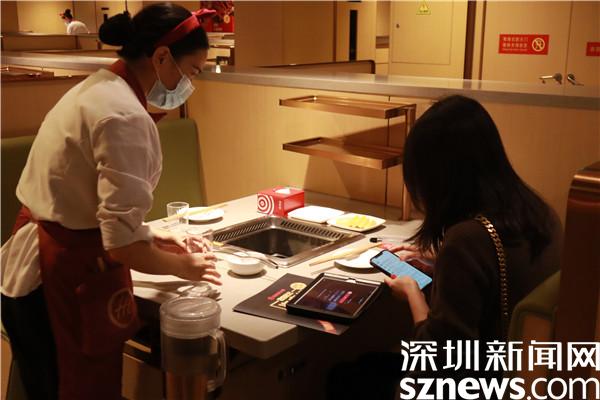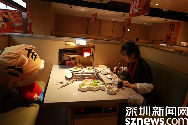 冬季是火鍋消費的旺季,在用餐高峰期,位于深圳市羅湖區(qū)這家連鎖火鍋店里,可見門口顯眼處貼著“半份菜 滿份愛”的海報,店內還有光盤行動等標語,還有一名光盤行動倡導員在餐廳內不時給消費者溫馨提示,倡導顧客適量點餐。