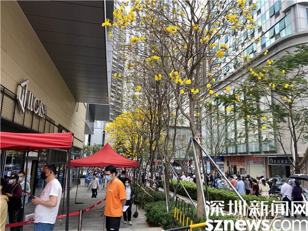 在國速中心廣場,黃花鈴木開得正好,藍(lán)天白云下是有序的核酸檢測隊(duì)伍,“大白”和“小藍(lán)”們正忙碌不停。據(jù)悉,這是桂園街道所屬的松園社區(qū)的一個(gè)核酸檢測點(diǎn),地處于商業(yè)旺區(qū)附近,人口較多,所以核酸檢測隊(duì)伍也相對(duì)其他核酸檢測點(diǎn)長。羅湖區(qū)政協(xié)委員、深圳市國速房地產(chǎn)開發(fā)有限公司董事長黃少兵表示,這個(gè)核酸檢測點(diǎn)從1月初就設(shè)立了,“由于國速中心廣場較寬敞,滿足了通風(fēng)和人流需求。”