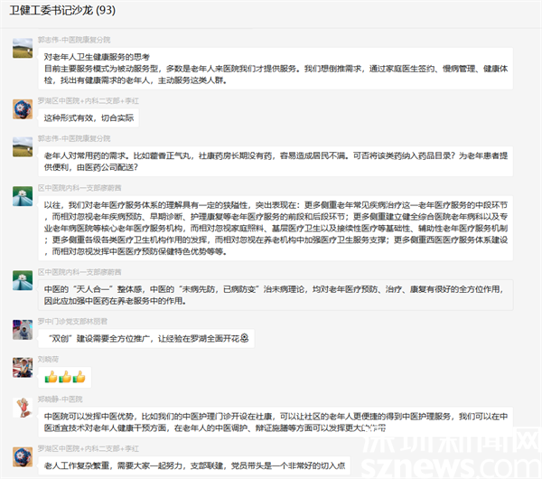 此次沙龍活動在一個小時內(nèi),收到各書記參與討論的信息超過200條,大家參與情緒熱烈。下一步,羅湖區(qū)委衛(wèi)生健康工委將把此次“書記沙龍”提出的好建議作為下一步老年健康服務工作的改進方向,力促沙龍形成的經(jīng)驗、思路切實轉(zhuǎn)化為實際舉措和工作亮點,在黨建業(yè)務融合、健康共建共治、探索創(chuàng)新實踐上持續(xù)發(fā)力,不斷提升群眾的滿意度和獲得感,真正成為群眾的“暖心人”“貼心人”。