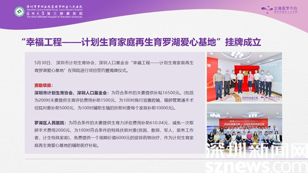 今年初,深圳市計劃生育協(xié)會、人口基金會就創(chuàng)建了一項“幸福工程”,旨在為計劃生育家庭再生育提供幫助。今年5月30日,第一個幸福工程基地就選擇坐落于羅湖醫(yī)院,項目為符合條件的夫妻提供總額高達16500元的醫(yī)療補貼,同時,羅湖醫(yī)院還給予相應的醫(yī)療減免,包括手術及藥品費用的配套補貼。為居民再生育提供了很好的幫助,大大降低了經(jīng)濟壓力,讓更多的家庭愿意再生育。