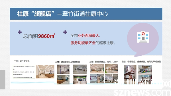2021年3月,全市業(yè)務面積最大、服務功能最齊全的羅湖醫(yī)院集團翠竹街道社康中心投入使用??偯娣e9860平方米共有4層,分設不同功能區(qū)。一樓為診療區(qū),涵蓋全科診療區(qū)、專家工作室、醫(yī)學影像檢查區(qū)等;二樓為健康管理區(qū),為居民提供全周期的健康體檢及檢后健康管理服務,還設有超聲、檢驗、DR等科室;三樓為預防保健區(qū),口腔科、婦科,四樓為高危兒早期康復中心、名中醫(yī)館、中醫(yī)康復理療區(qū)。
