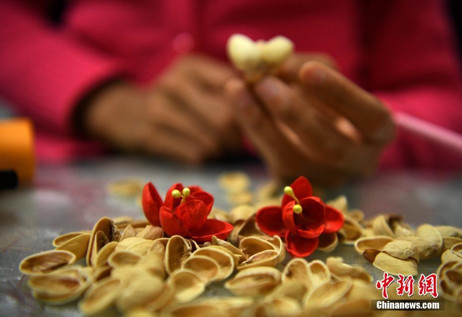 四川樂(lè)山29歲的陳艷因“先天性脆骨癥”被稱(chēng)為“瓷娃娃”,下肢無(wú)力支撐正常行走,其在愛(ài)心人士的鼓勵(lì)和幫助下,用不懈的毅力、勤奮和靈巧的雙手,在逆境中快樂(lè)堅(jiān)強(qiáng)生活。圖為3月1日,陳艷用開(kāi)心果制作裝飾品“梅花”。