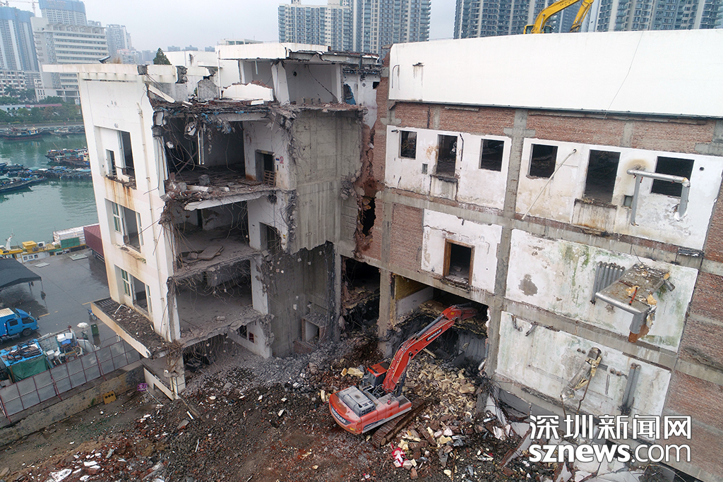從高空俯瞰,漁人碼頭水產(chǎn)交易市場(chǎng)和制冰廠房屋的房屋拆除速度非???,不少拆除機(jī)器正在工作
