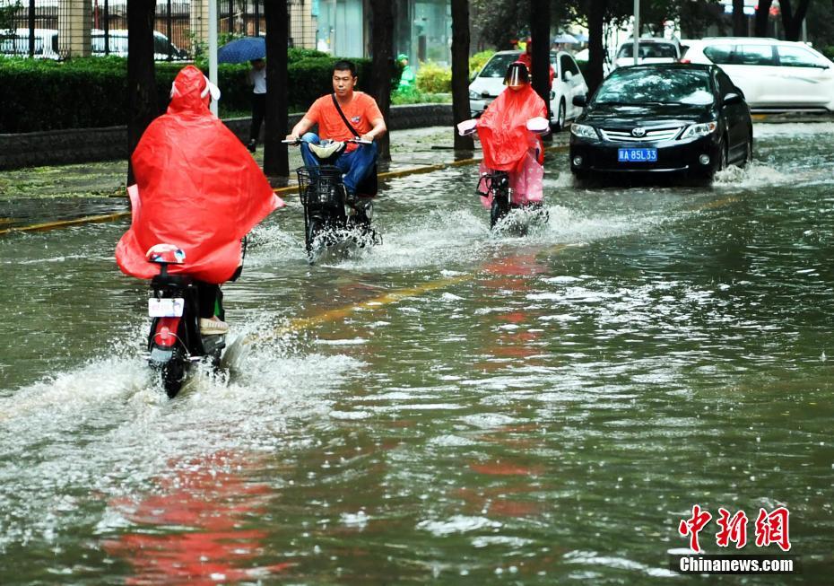 7月16日下午,河北石家莊一條馬路積水嚴(yán)重,民眾涉水騎行。當(dāng)日,該省氣象臺(tái)發(fā)布暴雨藍(lán)色預(yù)警,承德、雄安新區(qū)、廊坊北部、石家莊中西部、邢臺(tái)西部等多地遭受暴雨襲擊。中新社記者翟羽佳 攝