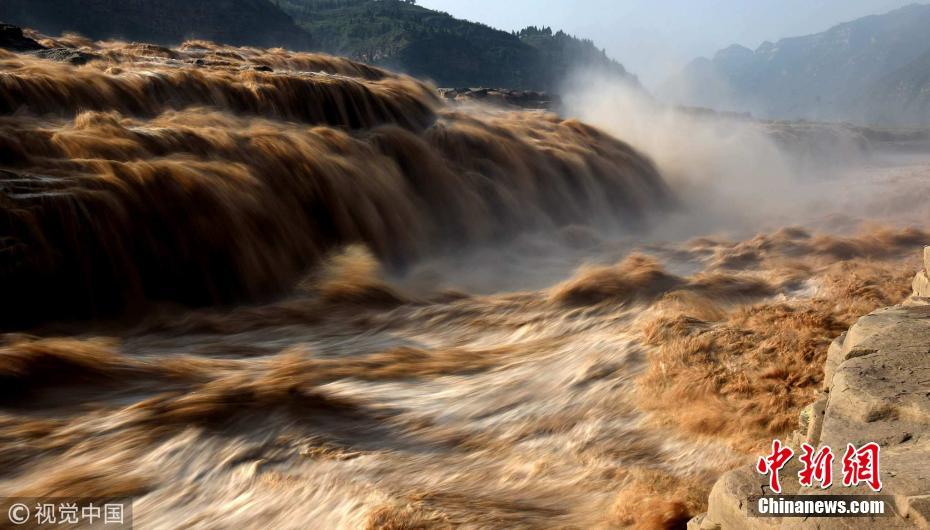 7月17日,山西臨汾,游客在黃河壺口瀑布游覽觀瀑。進(jìn)入7月主汛期,受黃河上游降雨量增多影響,位于山西吉縣和陜西宜川縣交界的黃河壺口瀑布水量暴漲。濁浪滔天的壯美瀑布群景觀,吸引了眾多游客。呂桂明攝 圖片來源:視覺中國(guó)