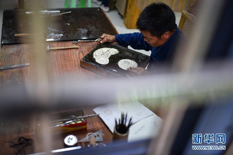 8月3日,銀匠龍懂陽在制作苗族銀飾。