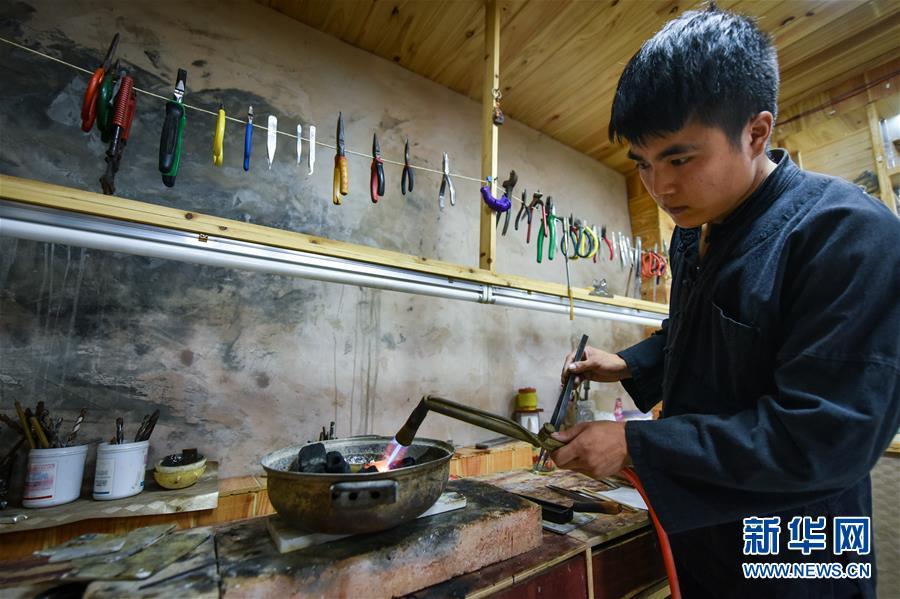 龍懂陽的弟弟龍?zhí)栆彩倾y飾工藝傳人。和哥哥不同,弟弟主打的是銀飾文化體驗游,用自家傳統(tǒng)苗寨開設(shè)民宿,游客在此居住的同時,還能學(xué)習(xí)體驗銀飾品制作。每年暑期一到,家長孩子絡(luò)繹不絕。新客源、新銷路、新模式帶動雷山縣銀飾業(yè)不斷發(fā)展壯大,成為脫貧攻堅的重要產(chǎn)業(yè)。2017年,雷山縣控拜、麻料、烏高三個村銀飾品及相關(guān)產(chǎn)業(yè)銷售額超過1.5億元,吸引很多外出打工的年輕人回家創(chuàng)業(yè)。苗寨鍛銀聲在綠水青山間響遍千戶,也漸漸走出大山,聲名遠(yuǎn)播。新華社記者 李芒茫 攝