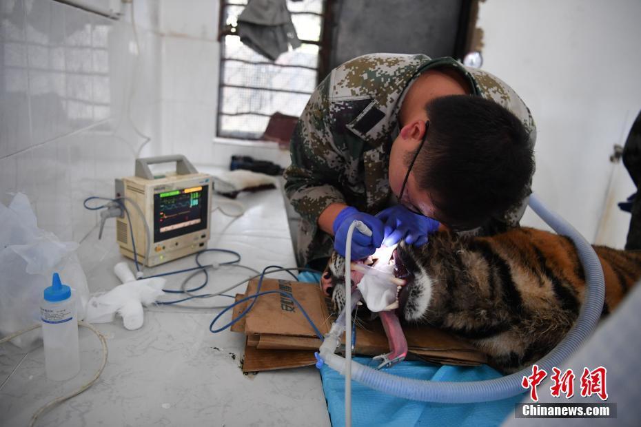 8月9日,獸醫(yī)使用洗牙機為老虎洗牙。當日,位于昆明的云南野生動物園獸醫(yī)通過呼吸麻醉的方式,為園中一只一歲的老虎清潔牙。中新社記者 劉冉陽 攝