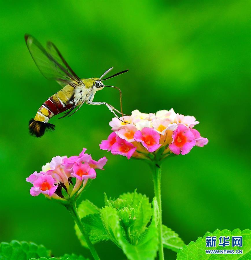 在福建省福州市溫泉公園,透翅天蛾在花間飛舞(8月18日攝)。近日,福建省福州市溫泉公園內(nèi)的馬纓丹大面積開(kāi)放?;t、草綠、蟲(chóng)飛,構(gòu)成了一幅和諧的閩都生態(tài)圖景。 新華社記者梅永存攝