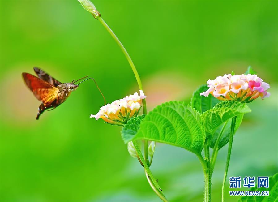 在福建省福州市溫泉公園,蜂鳥鷹蛾在花間飛舞(8月18日攝)。近日,福建省福州市溫泉公園內(nèi)的馬纓丹大面積開放?;t、草綠、蟲飛,構(gòu)成了一幅和諧的閩都生態(tài)圖景。 新華社記者梅永存攝