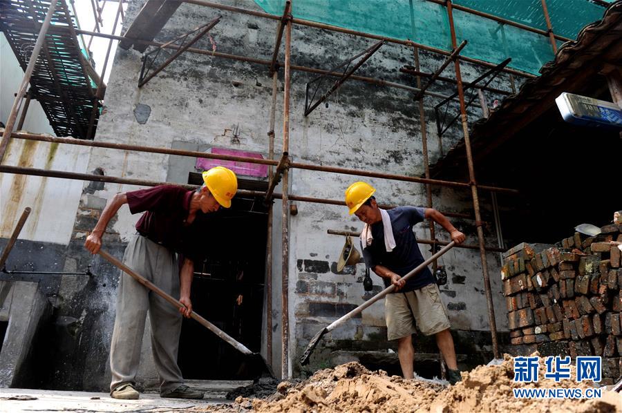 工人在對安徽涇縣黃田古村落一處古民居進(jìn)行修復(fù)施工(2014年7月10日攝)。