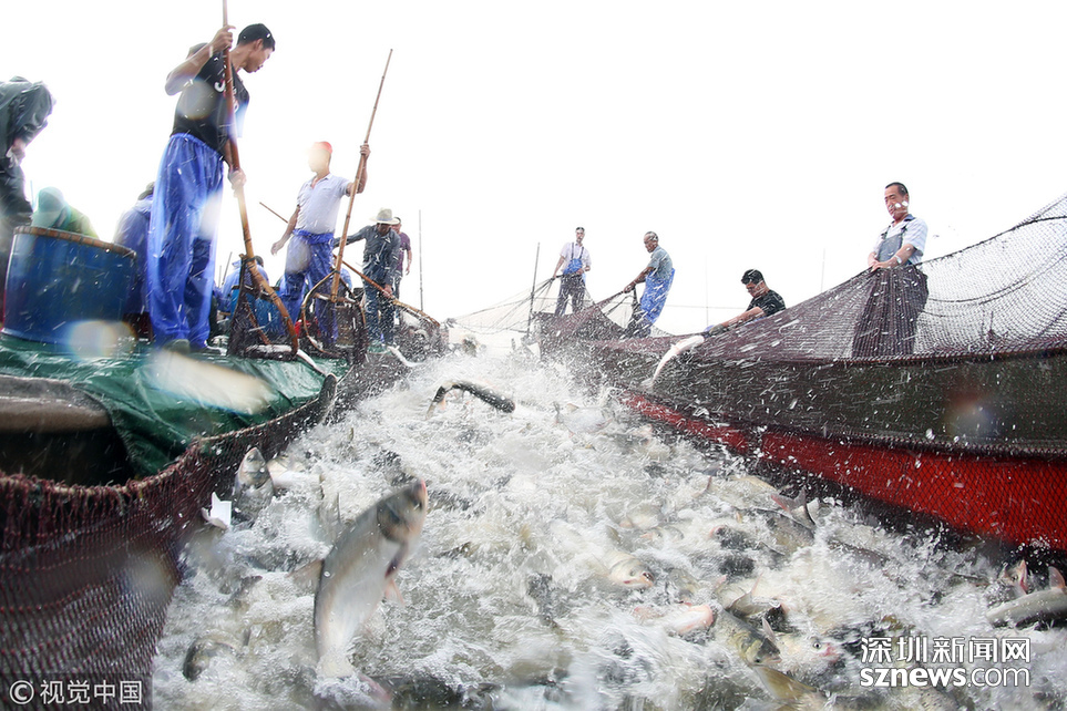 ??? 2018年6月26日,江蘇省常州市嘉澤鎮(zhèn)捕撈村的漁民組織夏季捕撈,一網(wǎng)魚達(dá)五萬(wàn)余斤,以鰱魚為主,供應(yīng)市場(chǎng)需求。夏捕的魚價(jià)較平時(shí)有所上漲,漁民粗略估計(jì)可增收上萬(wàn)余元。