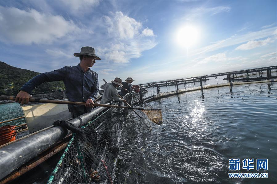 8月18日,南麂島海域內(nèi)的“海上牧場(chǎng)”養(yǎng)殖區(qū)內(nèi),漁民正捕撈大黃魚,處于仿生養(yǎng)殖環(huán)境的大黃魚需要生長(zhǎng)2至3年。進(jìn)入8月,浙江省溫州市平陽(yáng)縣南麂鎮(zhèn)海域上大片的大黃魚、貽貝等特色海產(chǎn)品養(yǎng)殖區(qū)域迎來(lái)豐收季節(jié),養(yǎng)殖戶們駕駛漁船在養(yǎng)殖區(qū)海域進(jìn)行打撈收獲,在碧海藍(lán)天下構(gòu)成了一幅“海上牧場(chǎng)”的美麗豐收景象。近年來(lái),南麂鎮(zhèn)政府引導(dǎo)漁民養(yǎng)殖戶充分發(fā)揮“靠海吃?!钡馁Y源優(yōu)勢(shì),大力發(fā)展海洋養(yǎng)殖經(jīng)濟(jì)和海島旅游經(jīng)濟(jì),實(shí)現(xiàn)了南麂由“生態(tài)美”向“產(chǎn)業(yè)美”,“產(chǎn)業(yè)美”向“經(jīng)濟(jì)美”的轉(zhuǎn)變。同時(shí)該鎮(zhèn)堅(jiān)持以大黃魚、貽貝等為特色產(chǎn)業(yè)支撐,精準(zhǔn)發(fā)展高效海洋養(yǎng)殖業(yè),重點(diǎn)培養(yǎng)一批新型職業(yè)漁民,依靠專業(yè)技術(shù)支持,實(shí)現(xiàn)深海仿生養(yǎng)殖,讓好生態(tài)造就好品質(zhì),重點(diǎn)打造南麂養(yǎng)殖品牌,組建營(yíng)銷網(wǎng)絡(luò),拓展特色海產(chǎn)品市場(chǎng)。新華社記者 徐昱攝