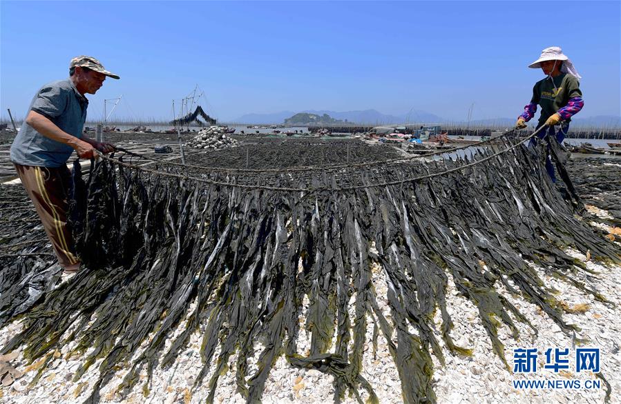 5月17日,在霞浦縣沙江鎮(zhèn)沙江村碼頭,養(yǎng)殖戶在晾曬海帶。