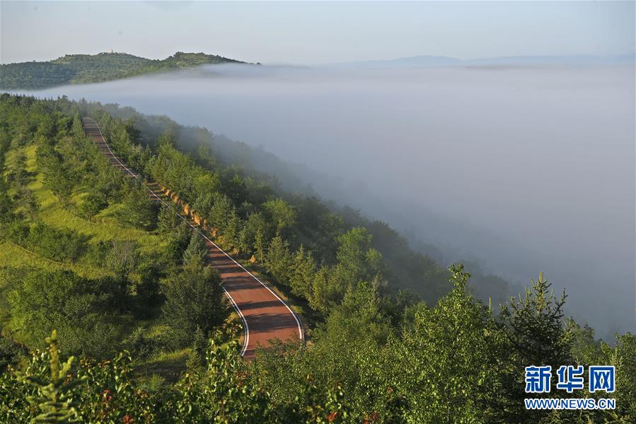 云霧繚繞的寧夏彭陽(yáng)縣金雞坪梯田公園(7月17日攝)。新華社記者 王鵬 攝
