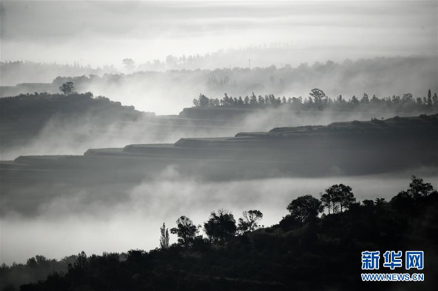 云霧繚繞的寧夏彭陽縣金雞坪梯田公園(7月17日攝)。新華社記者 王鵬 攝