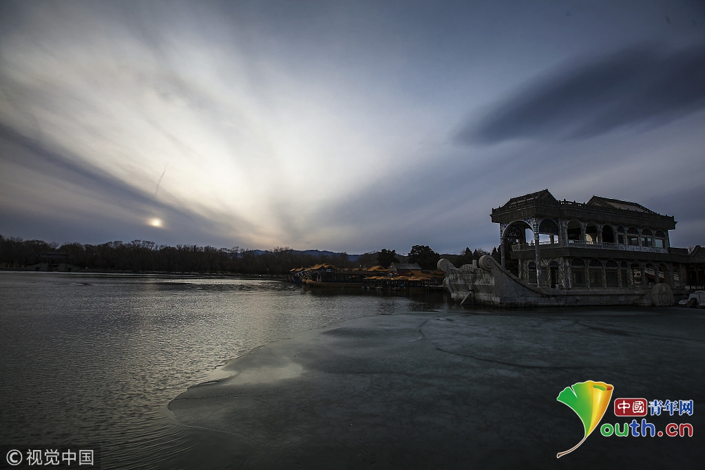 2018年2月23日,北京頤和園。當(dāng)天日落時(shí)分昆明湖上空出現(xiàn)夕陽余暉的美景,夢(mèng)幻般的色彩將古老的皇家園林裝扮得美輪美奐,讓人流連忘返。