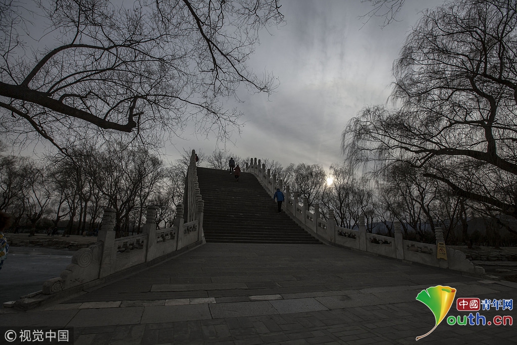 2018年2月23日,北京頤和園。當(dāng)天日落時(shí)分昆明湖上空出現(xiàn)夕陽余暉的美景,夢(mèng)幻般的色彩將古老的皇家園林裝扮得美輪美奐,讓人流連忘返。來源:視覺中國