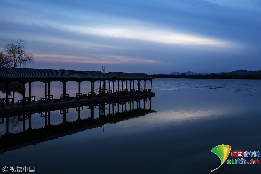 2018年2月23日,北京頤和園。當(dāng)天日落時分昆明湖上空出現(xiàn)夕陽余暉的美景,夢幻般的色彩將古老的皇家園林裝扮得美輪美奐,讓人流連忘返。來源:視覺中國