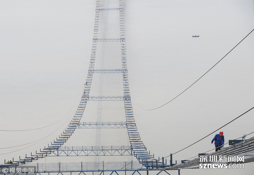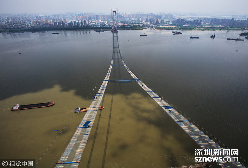 2018年5月14日,武漢,武漢楊泗港長(zhǎng)江大橋上空,上部結(jié)構(gòu)施工進(jìn)入貓道面網(wǎng)鋪設(shè)階段,數(shù)十名中鐵大橋局工人在跨江高空拼搏趕超,江面上空的臨時(shí)“吊橋”悄然形成。數(shù)十名工人在長(zhǎng)江上空228米處拼搏趕超,臨時(shí)“天梯”悄然形成。