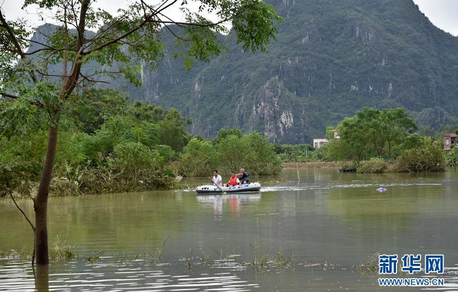 9月18日,廣東省陽(yáng)江市陽(yáng)春市陂面鎮(zhèn)政府工作人員在潭潦村被淹的農(nóng)田上查看水情。