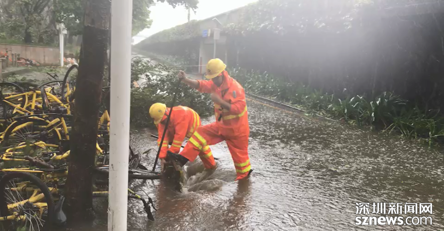 福田區(qū)位于北環(huán)皇崗立交,深圳市水務(wù)集團(tuán)福田分公司梅林所防洪排澇人員,趁風(fēng)勢雨小,打開雨水箅子排積水。