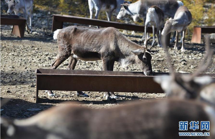9月18日,一頭馴鹿在內(nèi)蒙古大興安嶺根河林業(yè)局約安里林場吃飼料。新華社記者鄒予攝
