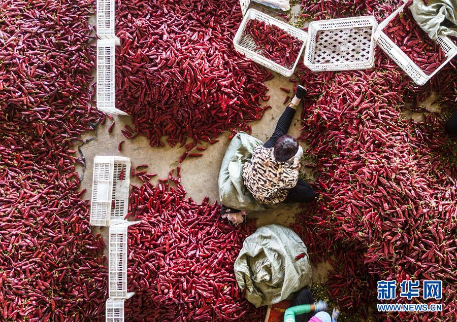 9月19日,在吉林省白城市通榆縣,農(nóng)民在分揀收獲的辣椒。  新華社記者 張楠 攝