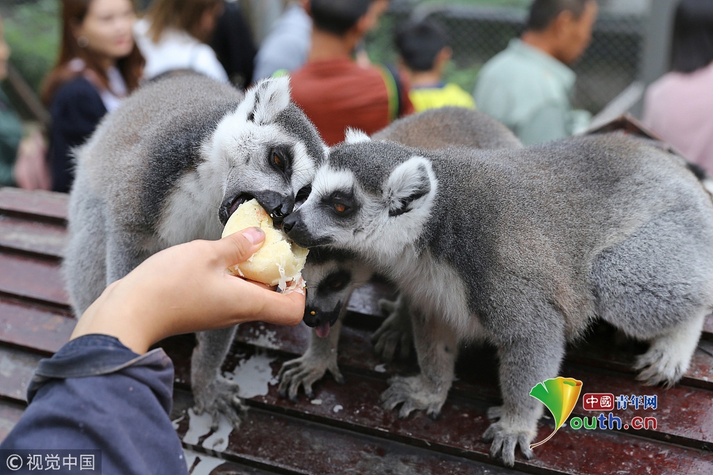 2017年10月4日,重慶永川樂(lè)和樂(lè)都的動(dòng)物飼養(yǎng)員給環(huán)尾狐猴喂食月餅。