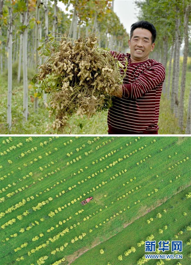 這張拼版照片顯示的是:上圖,9月18日,河北邢臺經(jīng)濟開發(fā)區(qū)郭龍莊村農(nóng)民王路坤展示收獲的花生;下圖,9月18日,王路坤駕駛農(nóng)機收獲花生(無人機拍攝)。  新華社記者牟宇攝