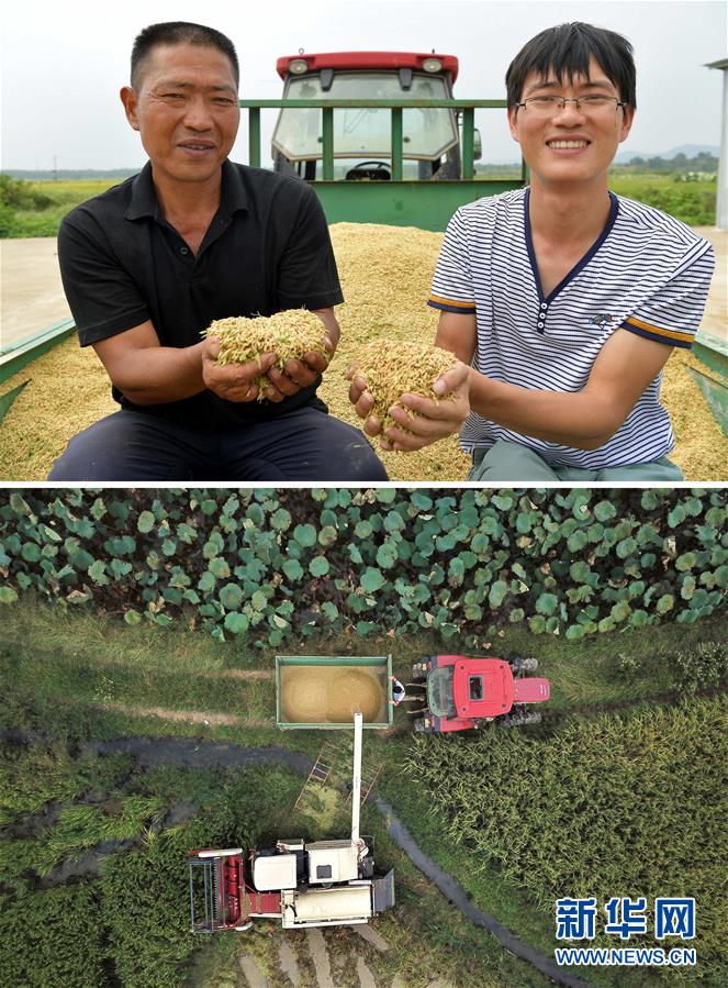 這張拼版照片顯示的是:上圖,9月21日,在江西省南昌市新建區(qū)留田村,種糧大戶周小林(左)、周標父子展示收獲的稻谷;下圖,9月21日,周小林、周標父子操作農(nóng)機收割中稻,同時將稻谷裝入拖拉機(無人機拍攝)。  新華社記者彭昭之?dāng)z