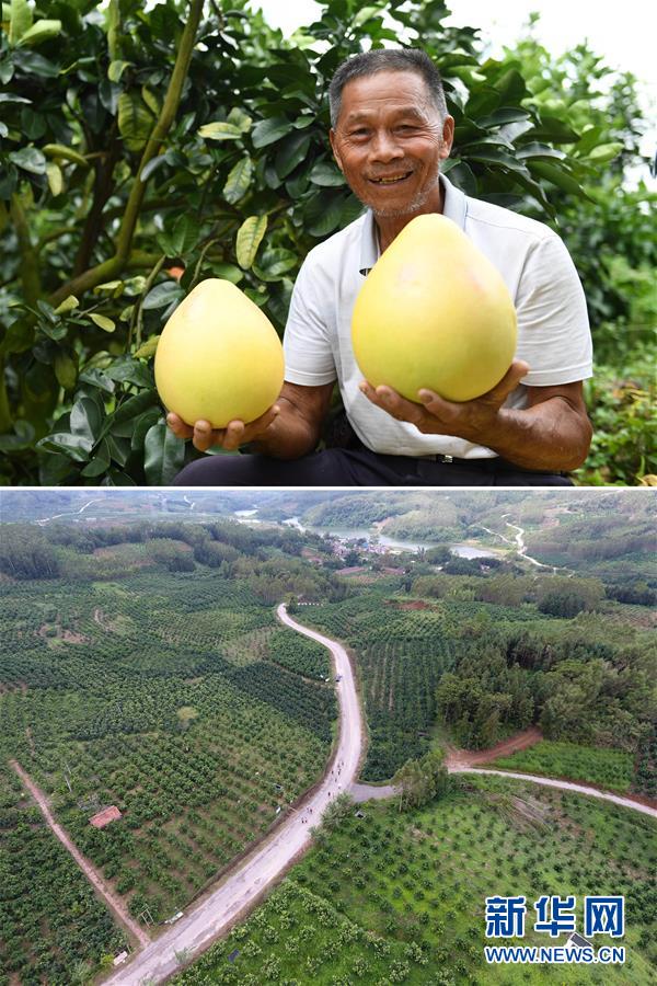 這張拼版照片顯示的是:上圖,9月18日,廣西武宣縣東鄉(xiāng)鎮(zhèn)風(fēng)沿村村民陳紹桂展示剛采摘的蜜柚;下圖,9月18日,人們在風(fēng)沿村三紅蜜柚種植基地內(nèi)行走(無人機拍攝)。  新華社記者陸波岸攝