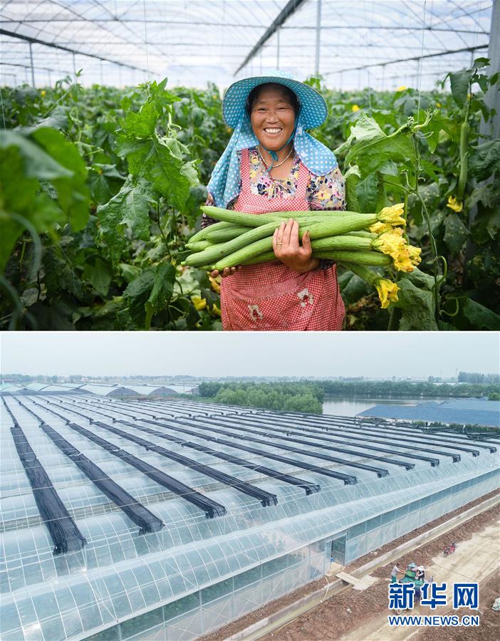 這張拼版照片顯示的是:上圖,9月21日,在江蘇省響水縣九豐現(xiàn)代高效農(nóng)業(yè)示范園的大棚內(nèi),56歲的農(nóng)民徐曉菊展示收獲的絲瓜;下圖,9月21日,徐曉菊(中)和村民一起搬運收獲的絲瓜(無人機拍攝)。  新華社記者季春鵬攝